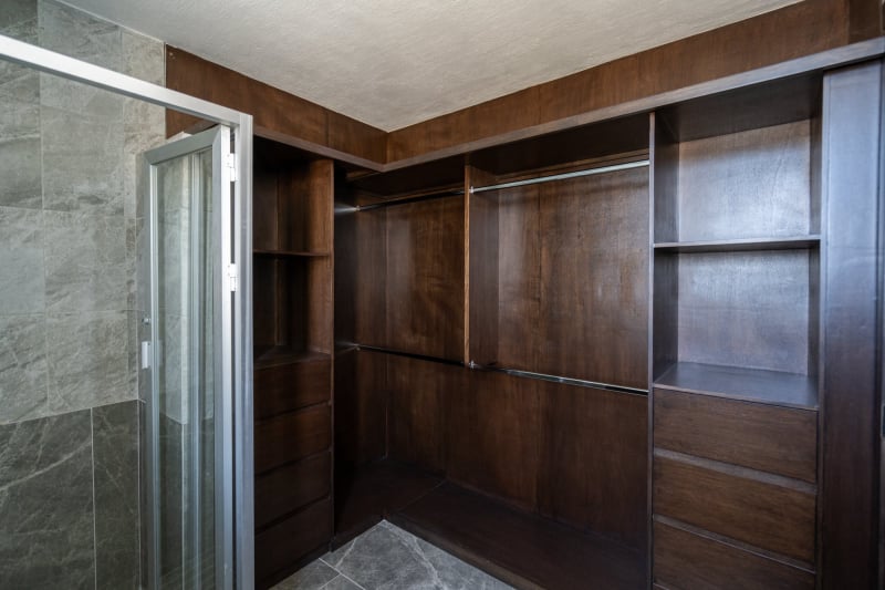 👉🏻Recámara principal con baño completo y vestidor forrado de madera